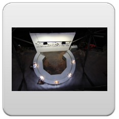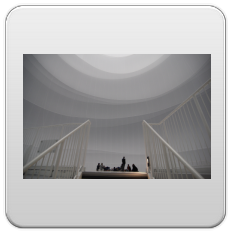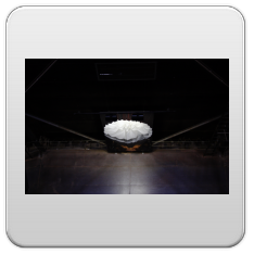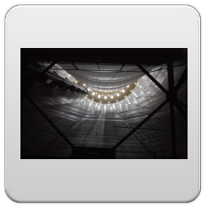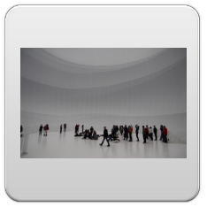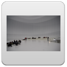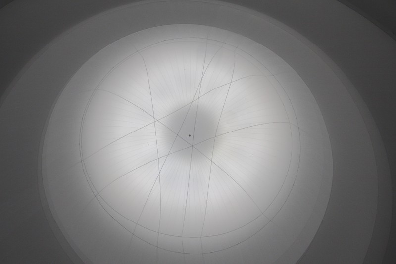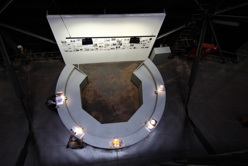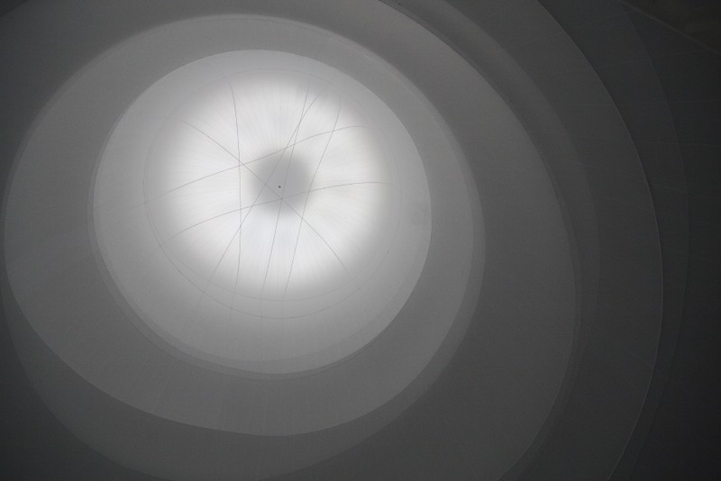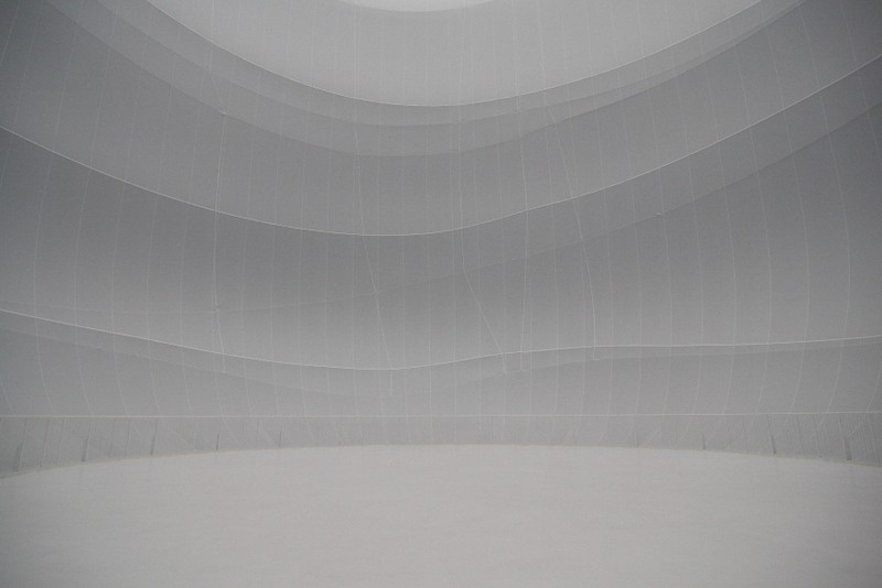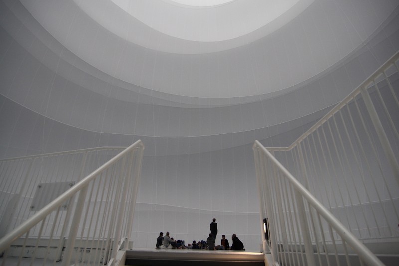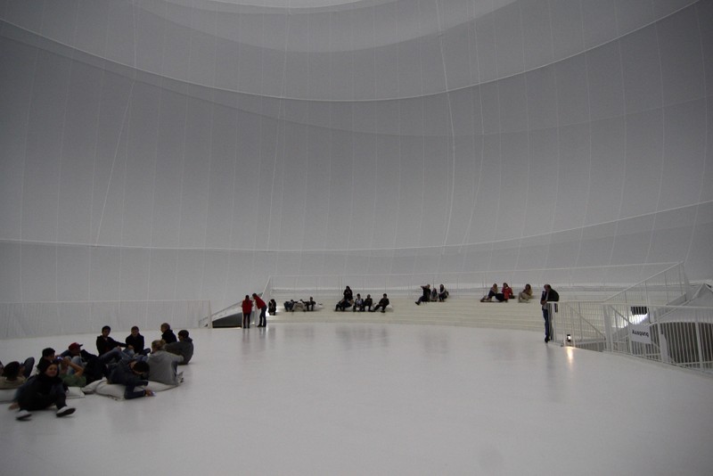 beleuchtet durch die dachfenster des gasometers und 60 strahler, erzeugt es in seinem inneren eine diffuse atmosphäre aus licht.