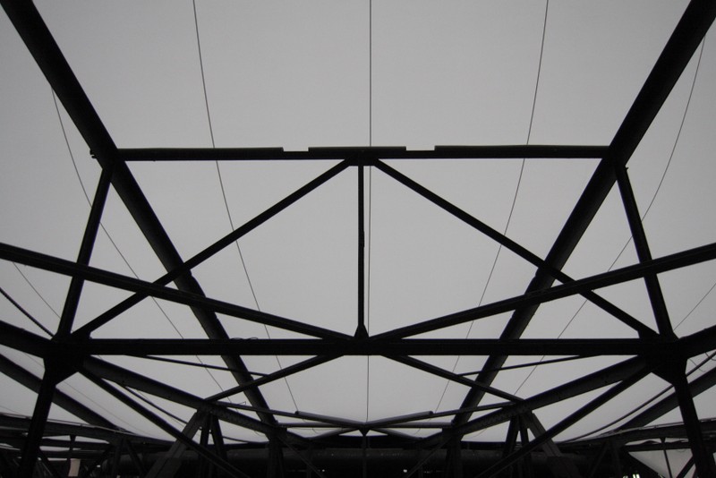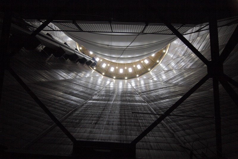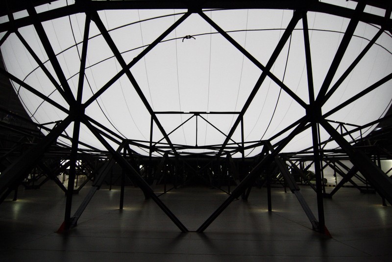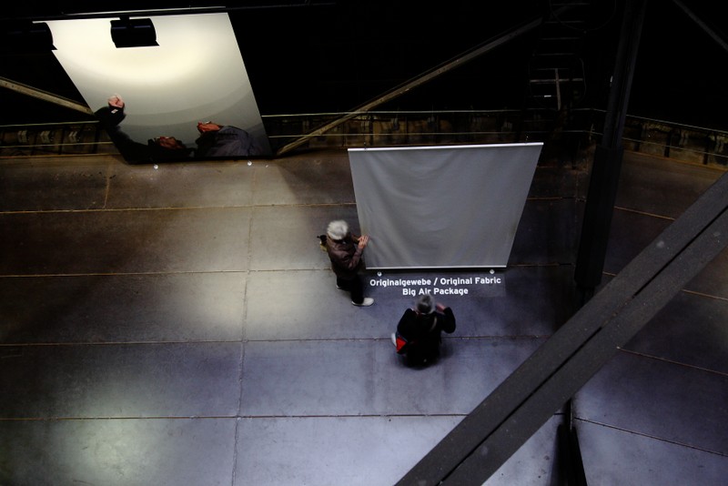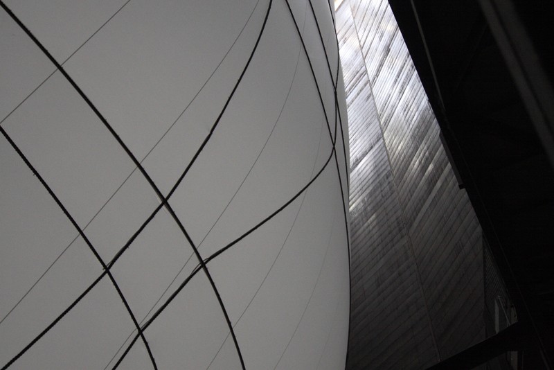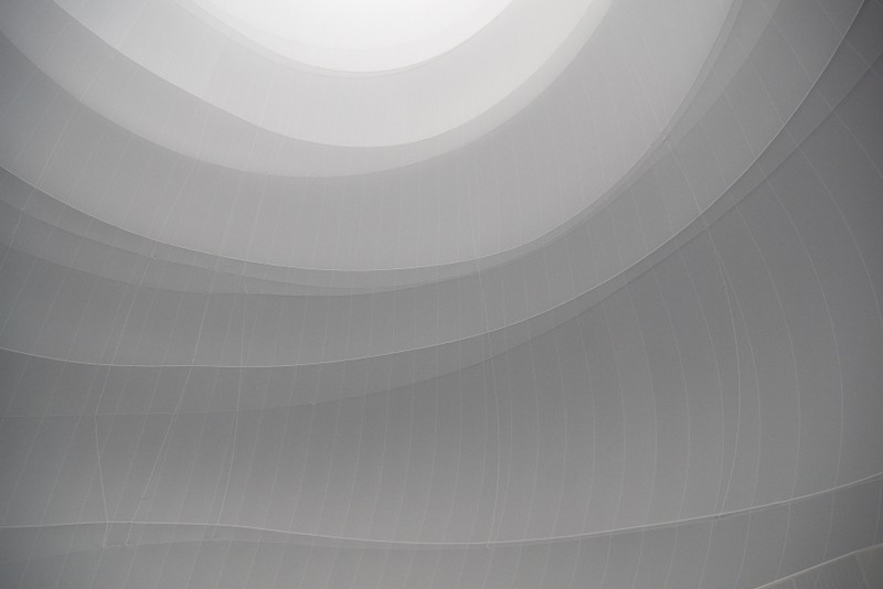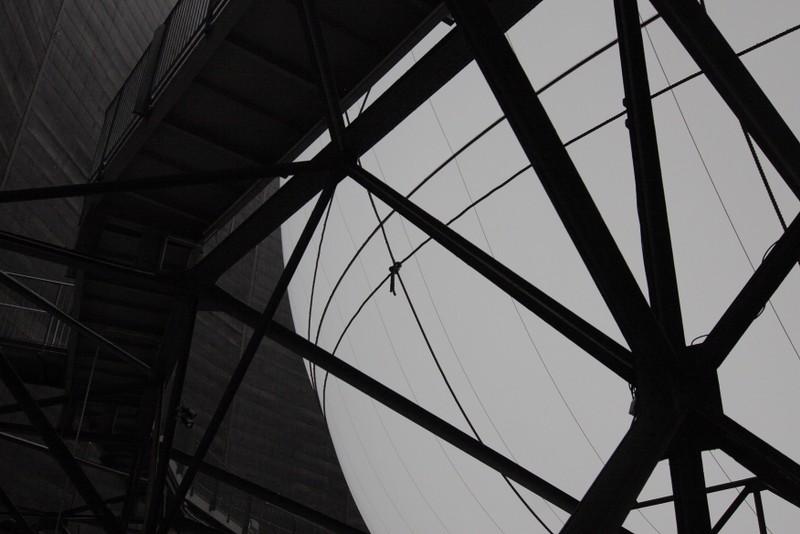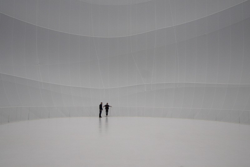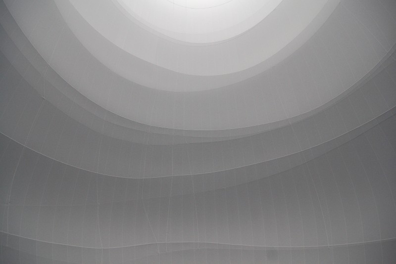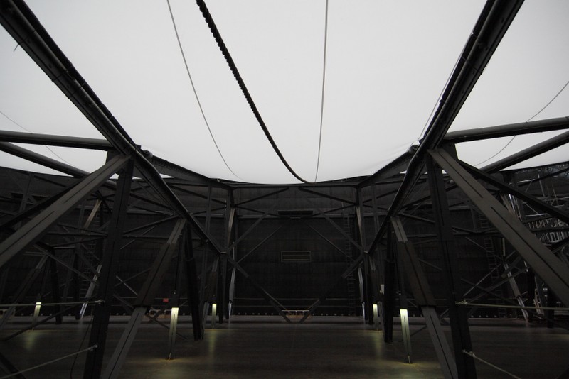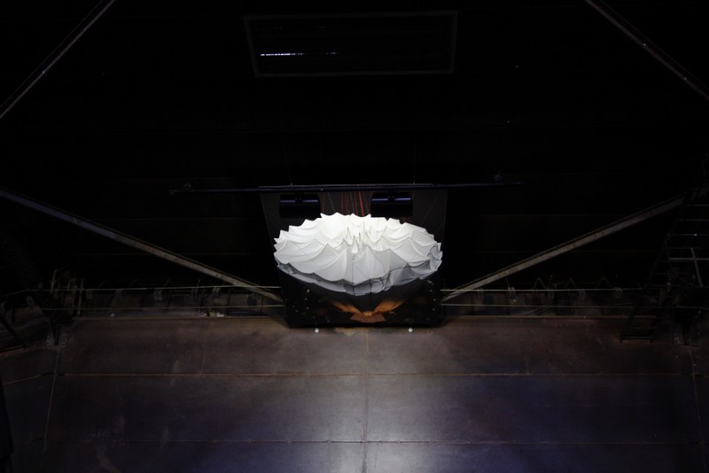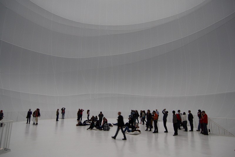 "die skulptur im inneren des gasometers wurde aus 20 350 quadratmetern lichtdurchlässigem gewebe